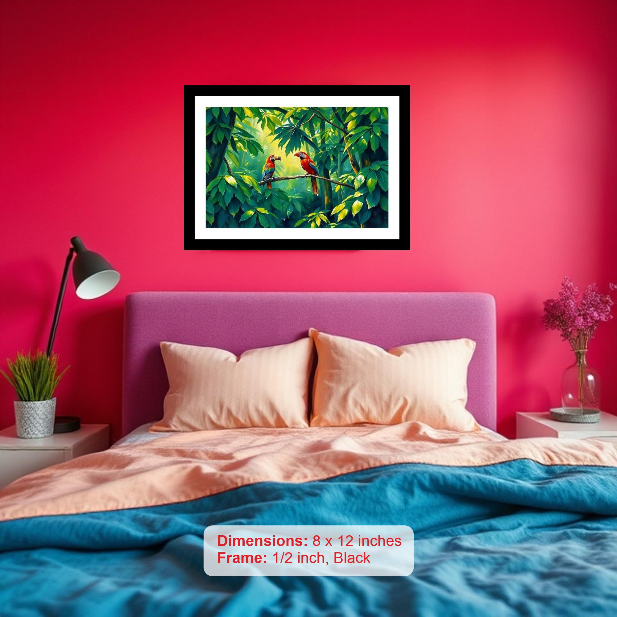 Add a call to action. Elevate your home decor with this captivating, digitally reprinted portrait featuring two vibrant parrots engaged in conversation amidst a lush, tropical green jungle setting. Encased in a classic black frame, this elegant piece adds a touch of sophistication and exotic charm to any room. The rich colors of the parrots and the detailed jungle foliage create a visually stunning and immersive experience, instantly transforming your space into a tranquil escape. This high-quality reprint captures the essence of the original artwork, ensuring lasting beauty and enjoyment. Perfect for living rooms, bedrooms, offices, or even as a unique gift, this framed portrait is a conversation starter and a timeless addition to your art collection. Bring the beauty of the tropics into your home today!