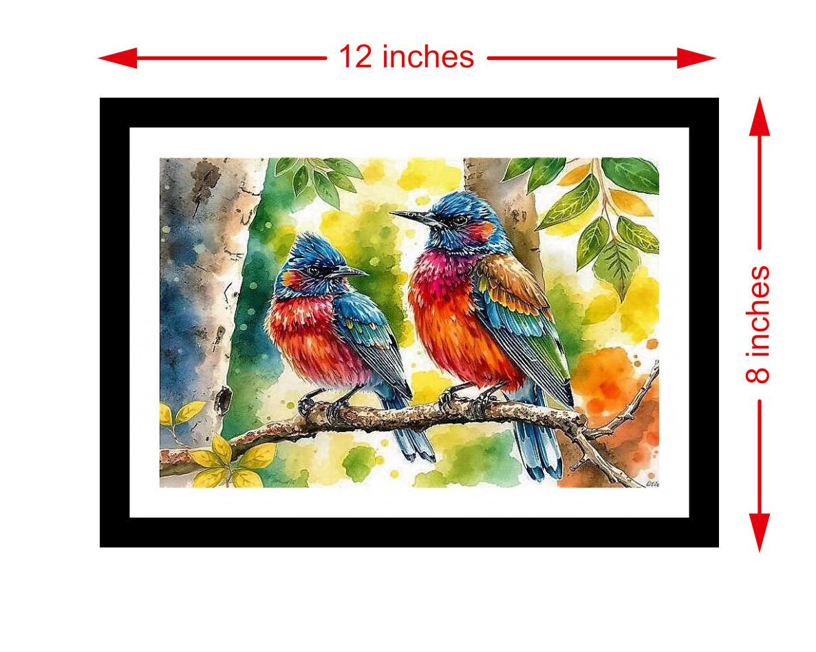Vibrant birds grace a tranquil jungle branch, a stunning display of color and serenity. The colors pop, and the print captures every delicate detail of the original portrait. The digital reprint boasts a striking composition, beautifully preserving the portrait's original artistry. Versatile Decor: Ideal for enhancing the aesthetic appeal of living rooms and bedrooms Enhanced Durability: Weather-shield laminated digital print for lasting vibrancy and protection Premium Framing: Constructed with a high-quality, durable fiber frame for long-term stability Precise Dimensions: 30 cm x 20 cm x 1 cm