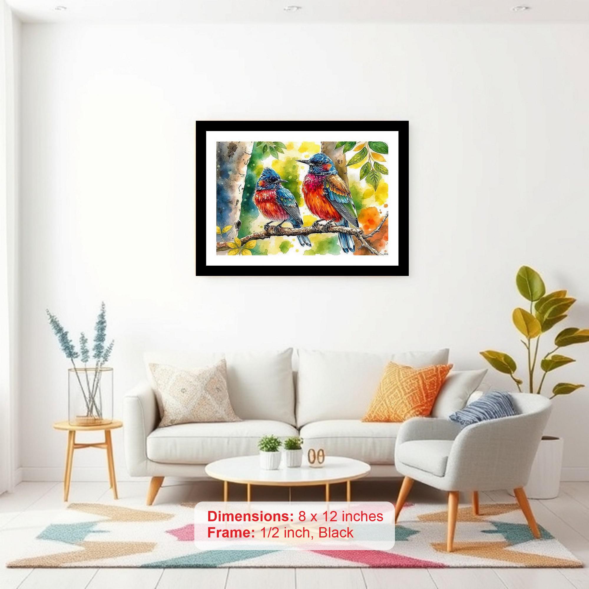 Enhance your home decor with timeless elegance and vibrant beauty with our classic black Framed Digital Reprint featuring a stunning portrait of two colorful birds perched gracefully on a tree branch amidst a serene, lush green jungle setting. This exquisite piece of art captures the delicate details and vivid hues of nature, bringing a touch of tranquility and sophistication to any room. The high-quality digital reprint ensures exceptional clarity and color accuracy, faithfully reproducing the original artwork's intricate details and rich tones. Encased in a sleek, classic black frame, this piece effortlessly complements a variety of interior styles, from traditional to modern, adding a touch of refined artistry to your living room, bedroom, office, or entryway. The contrasting black frame further accentuates the vibrant colors of the birds and the surrounding foliage, creating a captivating focal point that draws the eye and sparks conversation. This artwork not only serves as a beautiful decorative element but also evokes a sense of peace and wonder, transporting you to a tranquil jungle paradise. It's perfect for bird lovers, nature enthusiasts, or anyone seeking to add a touch of vibrant color and sophisticated charm to their living space. Durable and long-lasting, this framed print is ready to hang, making it a hassle-free way to elevate your home decor and create a welcoming and aesthetically pleasing atmosphere. Its timeless design ensures that it will remain a cherished piece for years to come, adding a touch of elegance and natural beauty to your home. Imagine the compliments you'll receive as guests admire this striking artwork and the serene ambiance it creates in your space. Bring the beauty of nature indoors with this captivating framed print and transform your home into a haven of tranquility and style.