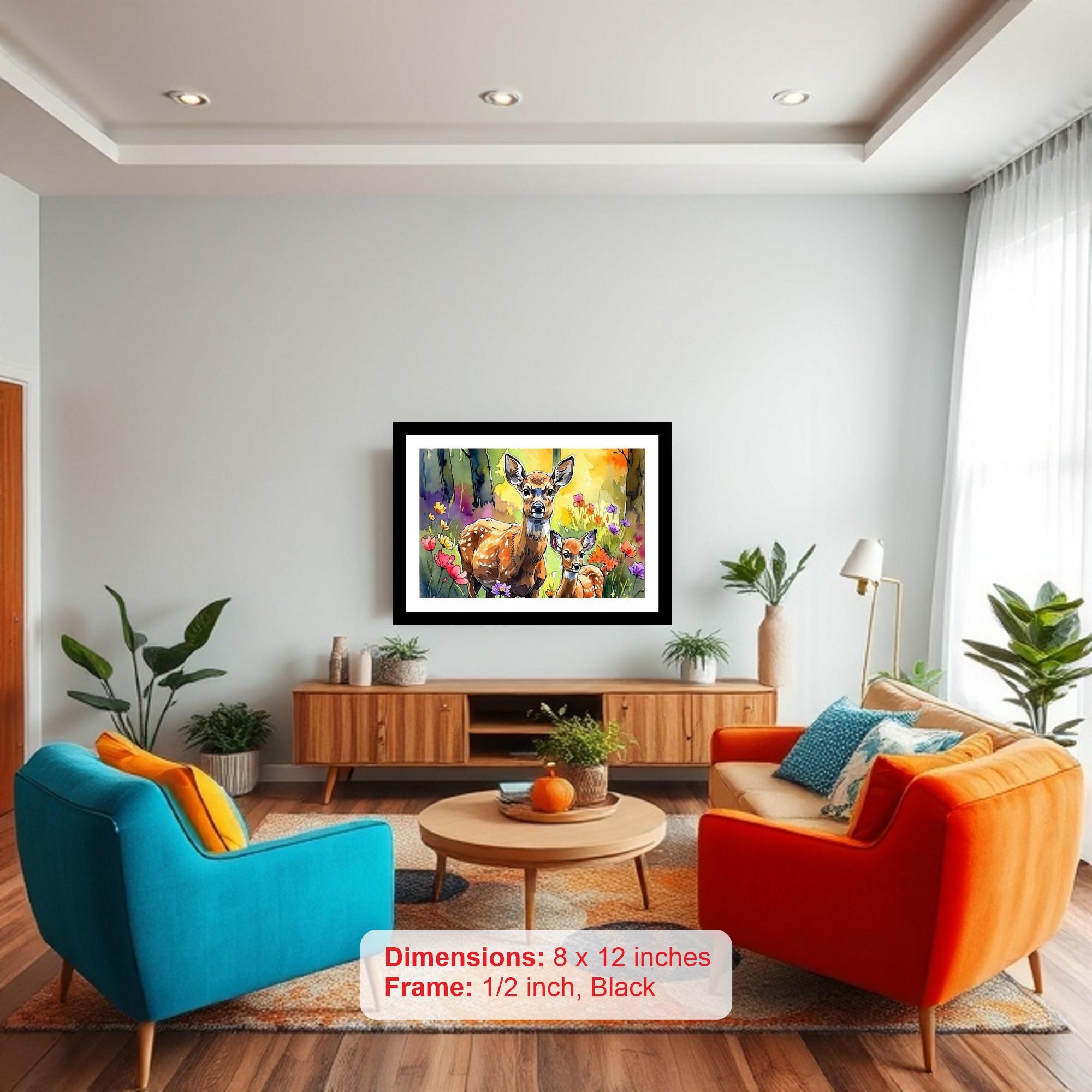 Capture the serene beauty of nature with our exquisite "Mother and Fawn in Wildflower Meadow" digital reprint. This elegant artwork, encased in a classic black frame, depicts a tender moment between a mother deer and her fawn, their gentle gazes radiating a sense of peace and tranquility. The vibrant wildflower meadow surrounding them bursts with color, creating a captivating scene that will add a touch of sophistication and natural charm to any room. Printed on high-quality archival paper, this digital reprint ensures exceptional clarity, detail, and lasting vibrancy, preserving the delicate nuances of the original artwork for years to come. The classic black frame complements the artwork perfectly, providing a refined and timeless aesthetic that seamlessly integrates into a variety of decor styles, from traditional to contemporary. Hang it in your living room, bedroom, office, or hallway to create a calming and inviting atmosphere. This stunning piece is not only a beautiful addition to your own home but also makes a thoughtful and heartfelt gift for nature lovers, art enthusiasts, or anyone who appreciates the beauty of the natural world. Bring the tranquility of the forest into your space with this enchanting "Mother and Fawn in Wildflower Meadow" digital reprint.