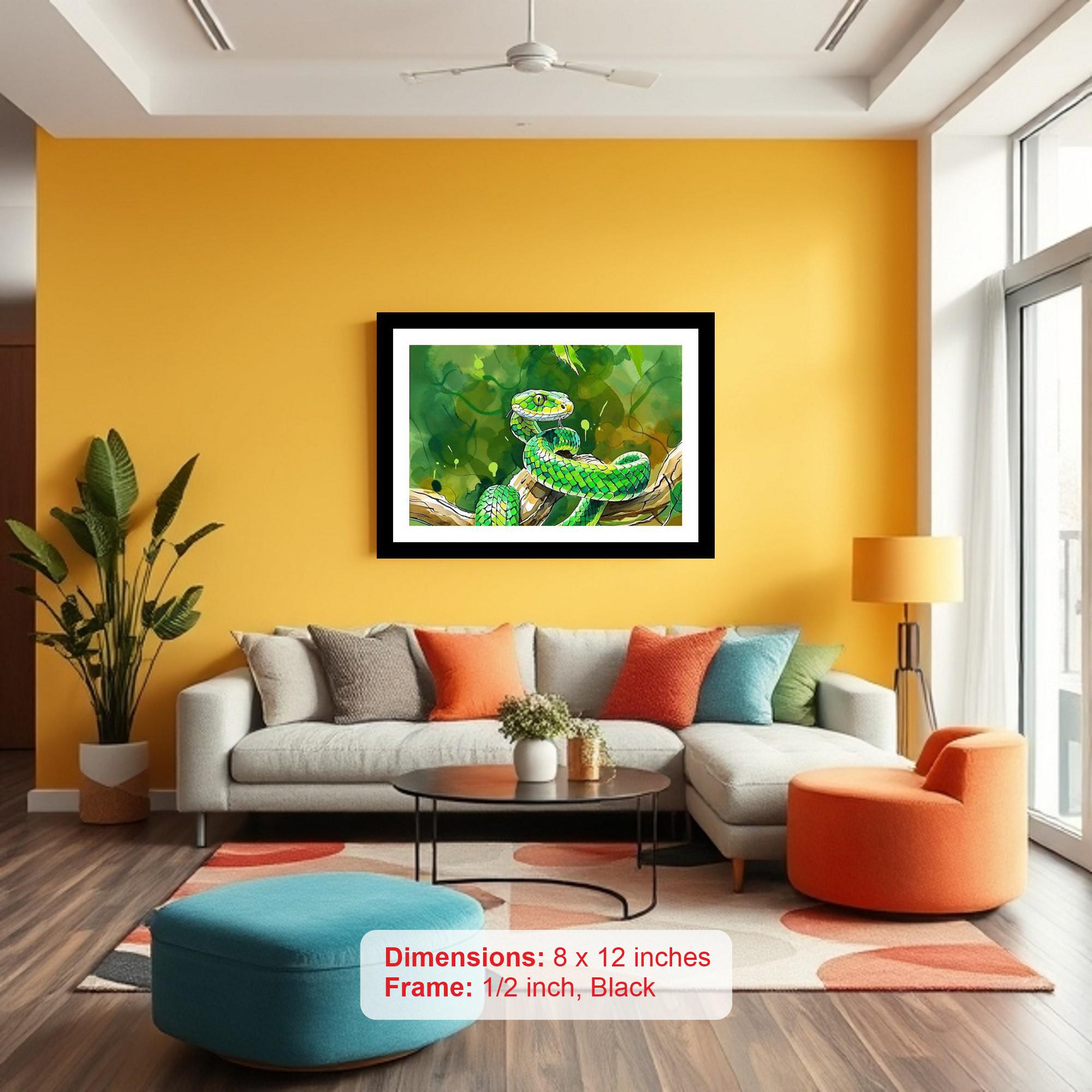 Elevate your home decor with our captivating classic black Framed Digital Reprint, showcasing a stunning portrait of nature's artistry. This elegant piece features a vibrant green snake, its scales gleaming with an almost iridescent quality, gracefully coiled around a sturdy branch within the heart of a lush, tropical jungle. The scene is bathed in dappled sunlight, meticulously rendered to capture the ethereal play of light and shadow filtering through the dense canopy above. Every detail, from the intricate patterns on the snake's skin to the delicate veins of the surrounding foliage, is brought to life with exceptional clarity and vibrant color thanks to our high-quality digital reprint process. The richness of the greens, the subtle variations in texture, and the overall depth of field create a truly immersive and captivating visual experience. Encased in a sleek, classic black frame, this artwork exudes sophistication and timeless appeal. The black frame provides a striking contrast to the vibrant colors within the print, further enhancing its visual impact and making it a versatile addition to any room. Whether you're looking to add a touch of exotic elegance to your living room, bedroom, office, or hallway, this framed portrait is sure to become a focal point and a conversation starter. The artwork's unique blend of natural beauty and artistic refinement makes it an ideal gift for nature enthusiasts, art lovers, or anyone seeking to infuse their space with a touch of sophisticated charm. Our commitment to quality ensures that this piece will remain a cherished part of your decor for years to come. The durable frame is crafted to protect the print and maintain its pristine condition, while the high-resolution digital reprint ensures that the colors and details remain vibrant and true to the original artwork. Bring the allure of the jungle into your home with this exquisite framed portrait and let its captivating beauty transform your living space.
