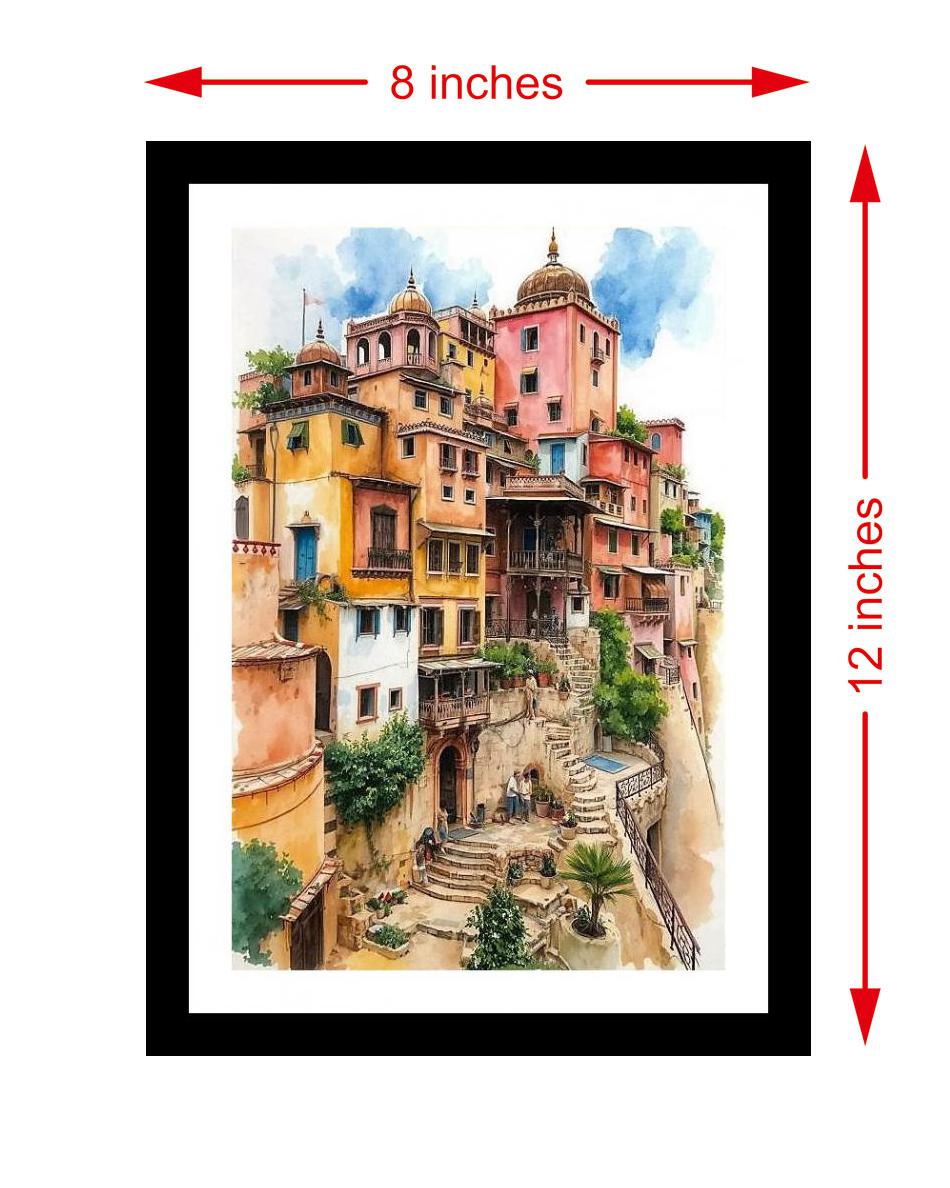 Mesmerizing Watercolor Portrait: Quaint Indian Hill Station Adorned with Charming Buildings Vibrant hues and crisp details evoke the artist's mastery. This digital reprint captures the captivating beauty of the original portrait with stunning clarity. This digitally remastered portrait captivates with its stunning composition. The interplay of light and shadow, the vibrant colors, and the artist's skillful brushstrokes create a mesmerizing work that brings the subject to life. A triumph of restored artistry. Versatile Decor: Ideal for enhancing the aesthetic appeal of living rooms and bedrooms Enhanced Durability: Weather-shield laminated digital print for lasting vibrancy and protection Premium Framing: Constructed with a high-quality, durable fiber frame for long-term stability Precise Dimensions: 30 cm x 20 cm x 1 cm