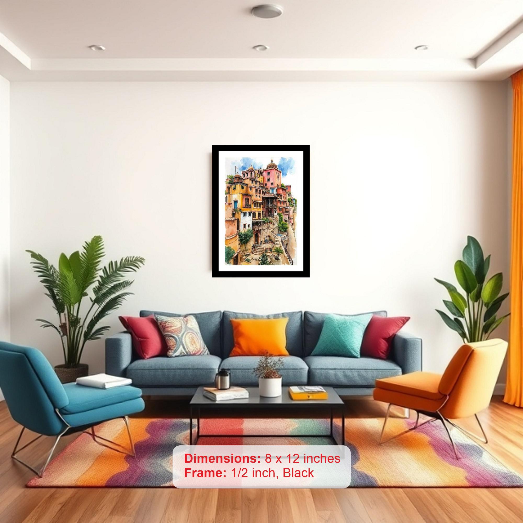 Enhance your home decor with this classic black framed digital reprint of a captivating watercolor painting depicting a charming Indian hill station. The artwork showcases quaint buildings nestled closely together, characteristic of the unique architectural style found in these serene mountain retreats. This elegant piece brings a touch of old-world charm and tranquility to any room. The high-quality digital reprint captures the delicate brushstrokes and vibrant colors of the original watercolor, ensuring a visually stunning and long-lasting display. The sophisticated black frame complements the artwork perfectly, adding a refined touch to your living room, bedroom, office, or any space that needs a touch of serene beauty. Perfect for art lovers, travel enthusiasts, and those seeking to infuse their surroundings with a sense of calm and nostalgia, this framed print is a timeless addition to any art collection. Its classic aesthetic blends seamlessly with various interior styles, making it a versatile and cherished piece. Bring the allure of the Indian hill stations into your home with this exquisite artwork.