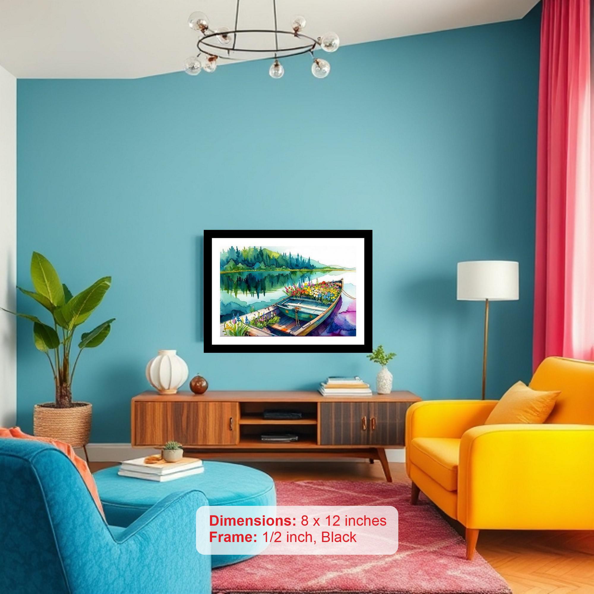 Elegantly capture the timeless beauty of a bygone era with this exquisite vintage digital reprint. This captivating artwork features a serene lake scene, where a tranquil rowboat gently rests upon the shimmering water. A vibrant floral display bursts with life and color, adorning the boat and adding a touch of whimsical charm to the peaceful landscape. The print is presented in a stunning black frame, meticulously crafted to complement the artwork's vintage aesthetic and enhance its overall elegance. This piece is more than just a picture; it's a window into a world of tranquility and artistic expression, perfect for adding a touch of vintage sophistication to any room. Whether you're an art enthusiast, a lover of vintage decor, or simply seeking a piece that evokes a sense of peace and beauty, this framed reprint is sure to become a cherished addition to your home.