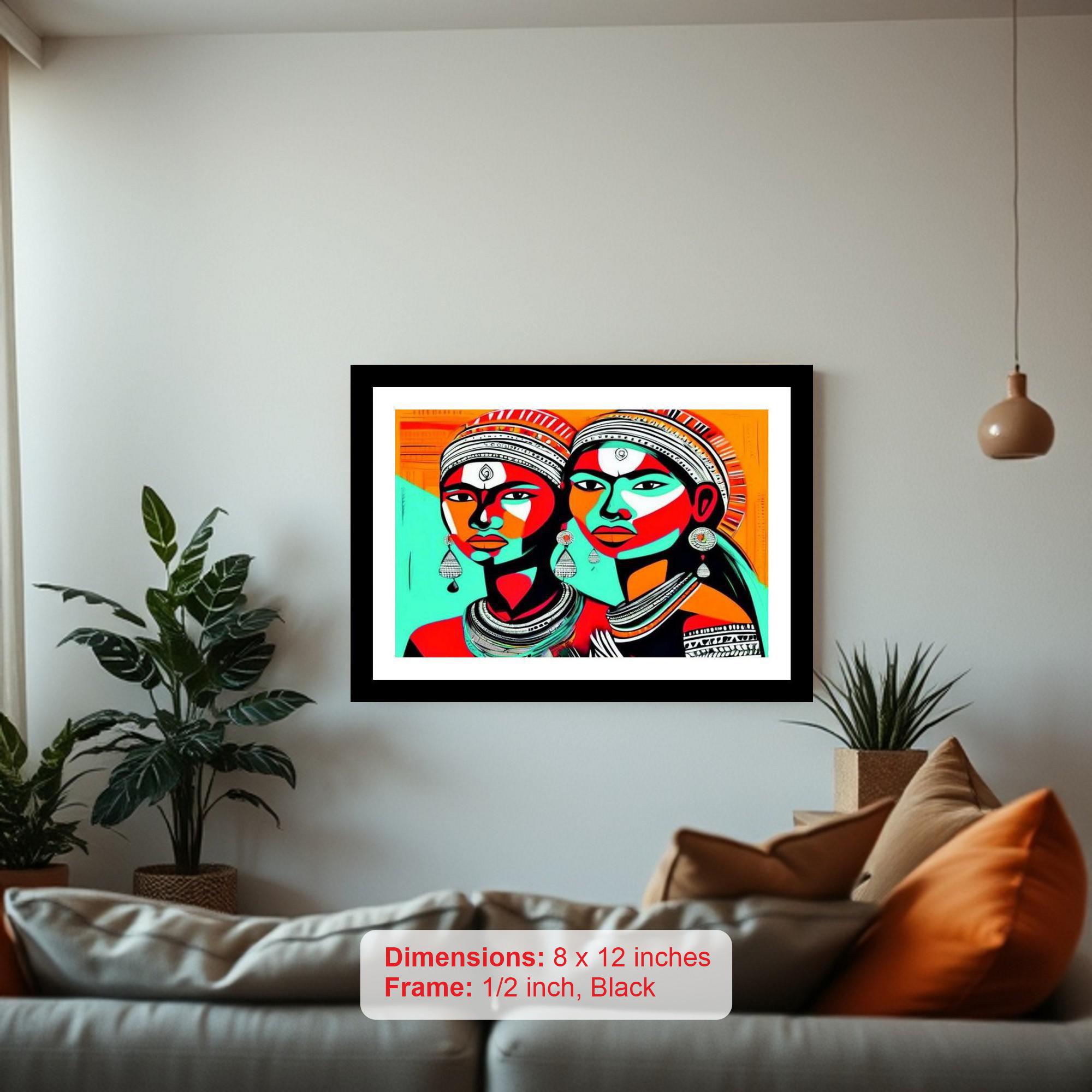 Elevate your home decor with this stunning vintage-inspired digital reprint, showcasing a captivating portrait of two women radiating confidence and elegance. Encased in a meticulously crafted black frame, the artwork features a vibrant and bold color palette, drawing the eye and adding a touch of bohemian sophistication to any room. The subjects are adorned in elaborate headdresses and intricate jewelry, each piece telling a story of cultural richness and artistic expression. This reproduction captures the essence of a bygone era, offering a timeless appeal that seamlessly blends with modern and traditional interiors alike. Whether displayed in your living room, bedroom, or office, this framed print serves as a striking conversation starter and a beautiful reflection of your unique style. It's an ideal choice for art enthusiasts, collectors, or anyone seeking to infuse their space with a touch of vintage glamour and empowering feminine energy. Bring home this exquisite piece and let it transform your walls into a gallery of artistic brilliance.