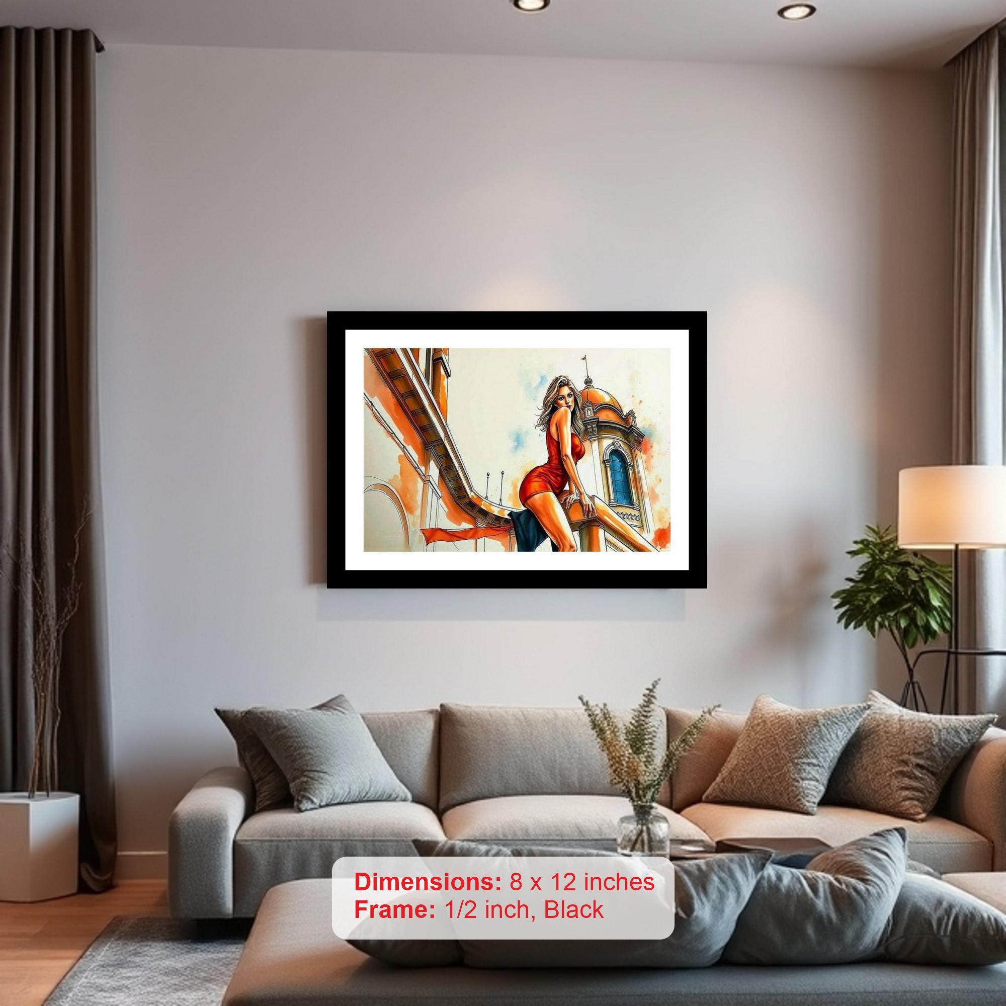 Elegance and timeless beauty converge in this exquisite vintage-inspired art piece. This digital reprint captures a stunning portrait of a woman in a vibrant red dress, gracefully posed on a balustrade. The composition immediately draws the eye, with the woman's confident stance and captivating gaze creating a sense of intrigue. Below her, a grand building stretches into the distance, its architectural details adding depth and grandeur to the scene. The entire image is framed by a meticulously crafted black frame, lending an air of classic sophistication and enhancing the artwork's overall aesthetic appeal. This piece serves as a focal point for any room, adding a touch of refined artistry to your home decor. Whether you're an admirer of vintage portraits, a lover of classical art, or simply seeking a statement piece to elevate your living space, this framed reprint is sure to impress. It offers a seamless blend of traditional charm and modern digital printing technology, ensuring that the vibrant colors and intricate details of the original artwork are faithfully reproduced.