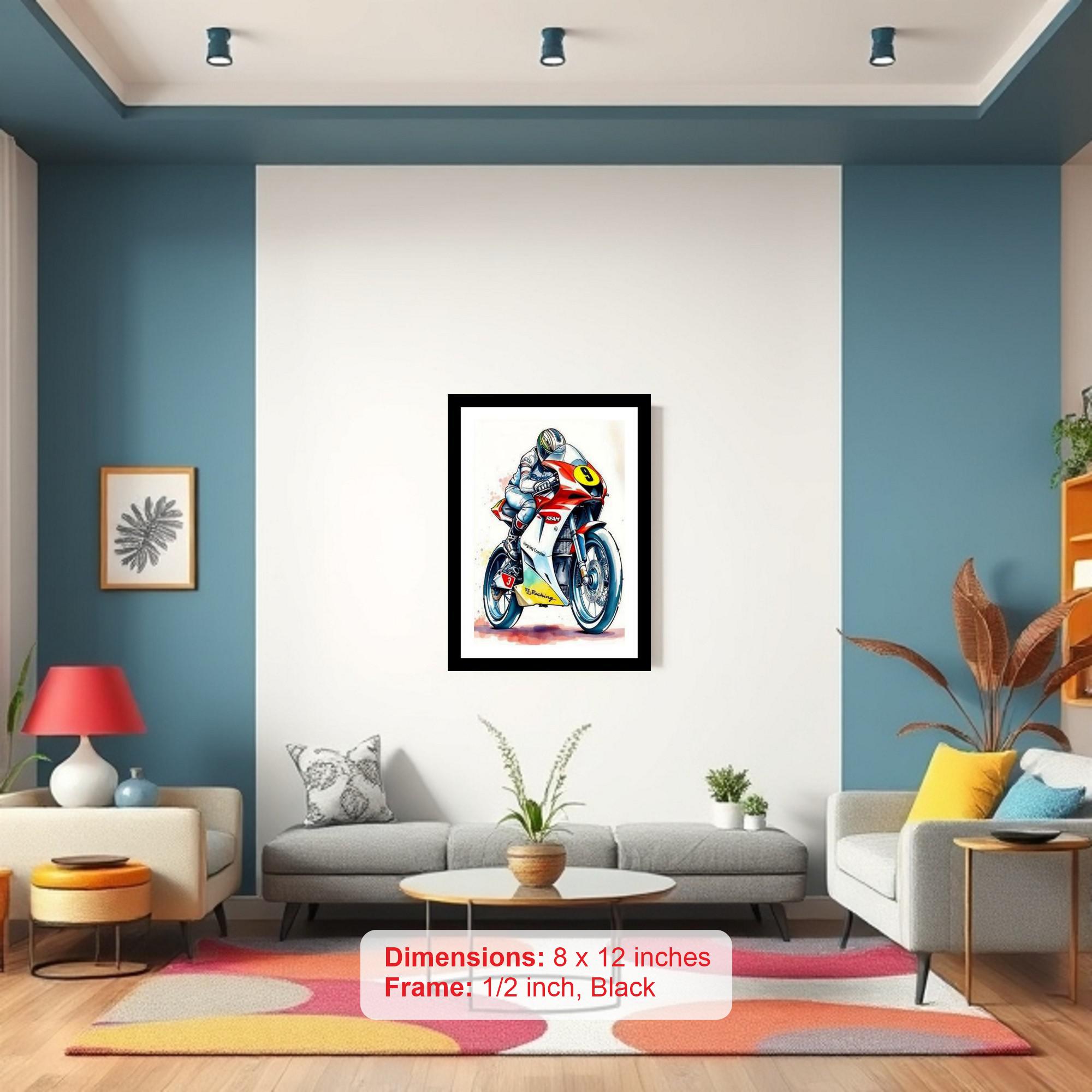 The artwork explodes with vibrant energy as the Racer and their custom bike blur across the track in a symphony of speed and design. The colors are vibrant, the print is crisp, and the portrait's beauty shines through in this stunning reproduction. The digital reprint boasts a strikingly composed portrait; the subject's essence radiates through masterful clarity. Versatile Decor: Ideal for enhancing the aesthetic appeal of living rooms and bedrooms Enhanced Durability: Weather-shield laminated digital print for lasting vibrancy and protection Premium Framing: Constructed with a high-quality, durable fiber frame for long-term stability Precise Dimensions: 30 cm x 20 cm x 1 cm