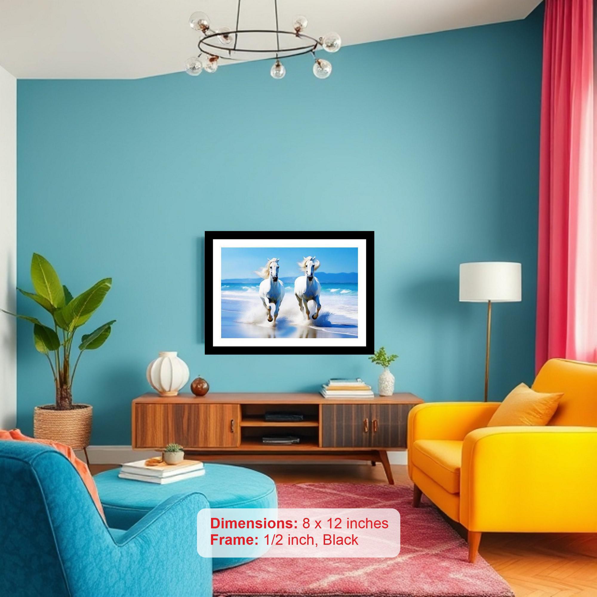 Bring timeless elegance to your home with this exquisite digital reprint, showcasing two majestic white horses galloping freely along a sun-drenched beach. The photograph, carefully reproduced to capture its original beauty, is presented in a classic black frame, adding a touch of classic charm. This stunning piece of wall art evokes a sense of freedom and serenity, perfect for creating a calming and sophisticated atmosphere in any room. Enhance your living space with this captivating image, a beautiful reminder of nature's power and grace.