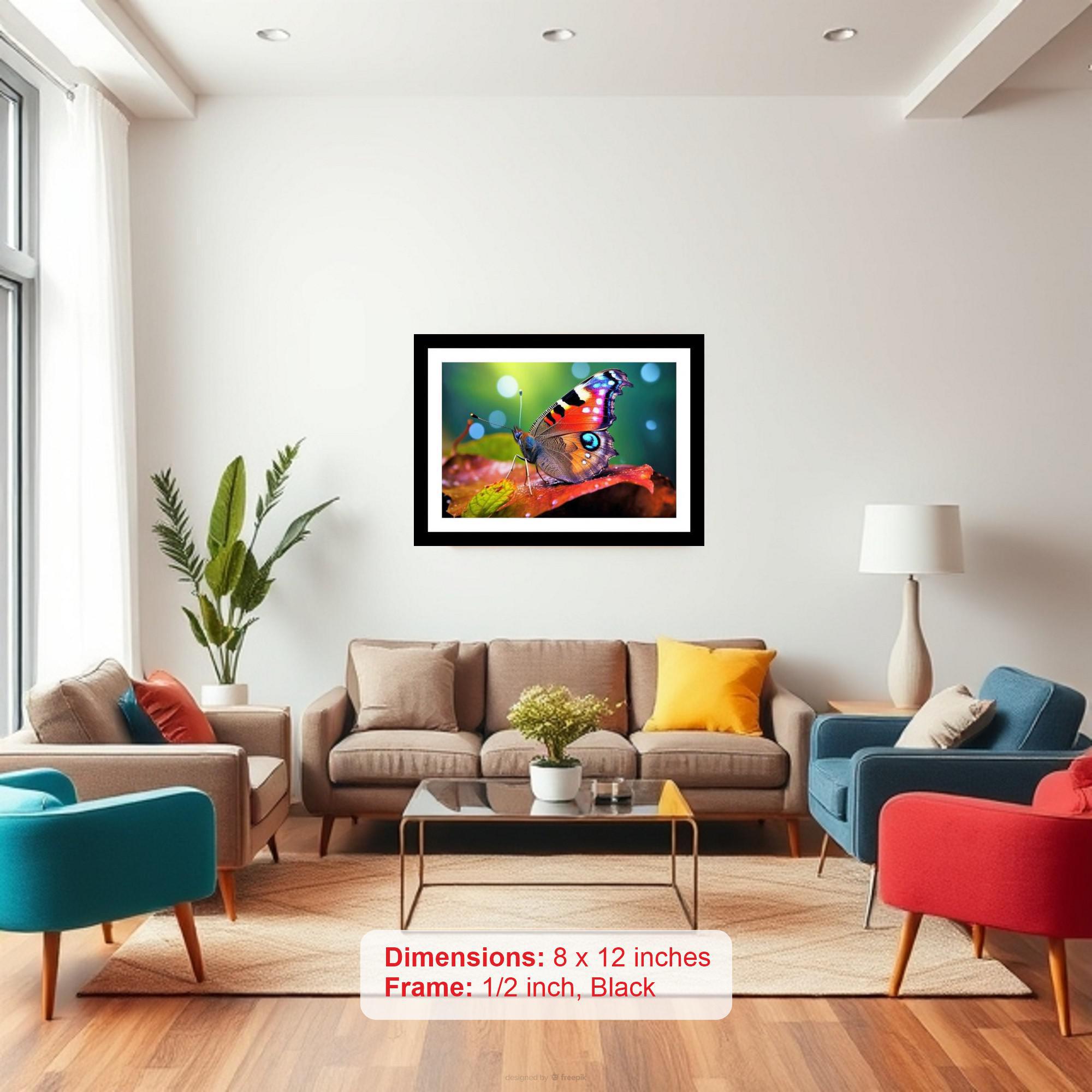 Capture timeless beauty with this exquisite digital reprint, showcasing a vibrant peacock butterfly delicately perched on a dew-kissed autumn leaf. Encased in an elegant, vintage-inspired black frame, this print evokes a sense of classic charm and natural wonder. The rich, warm tones of the black frame beautifully complement the butterfly's vivid colors and the leaf's autumnal hues, creating a visually stunning piece. Perfect for adding a touch of sophistication and nature's artistry to any room, this framed reprint is a conversation starter and a lasting treasure.