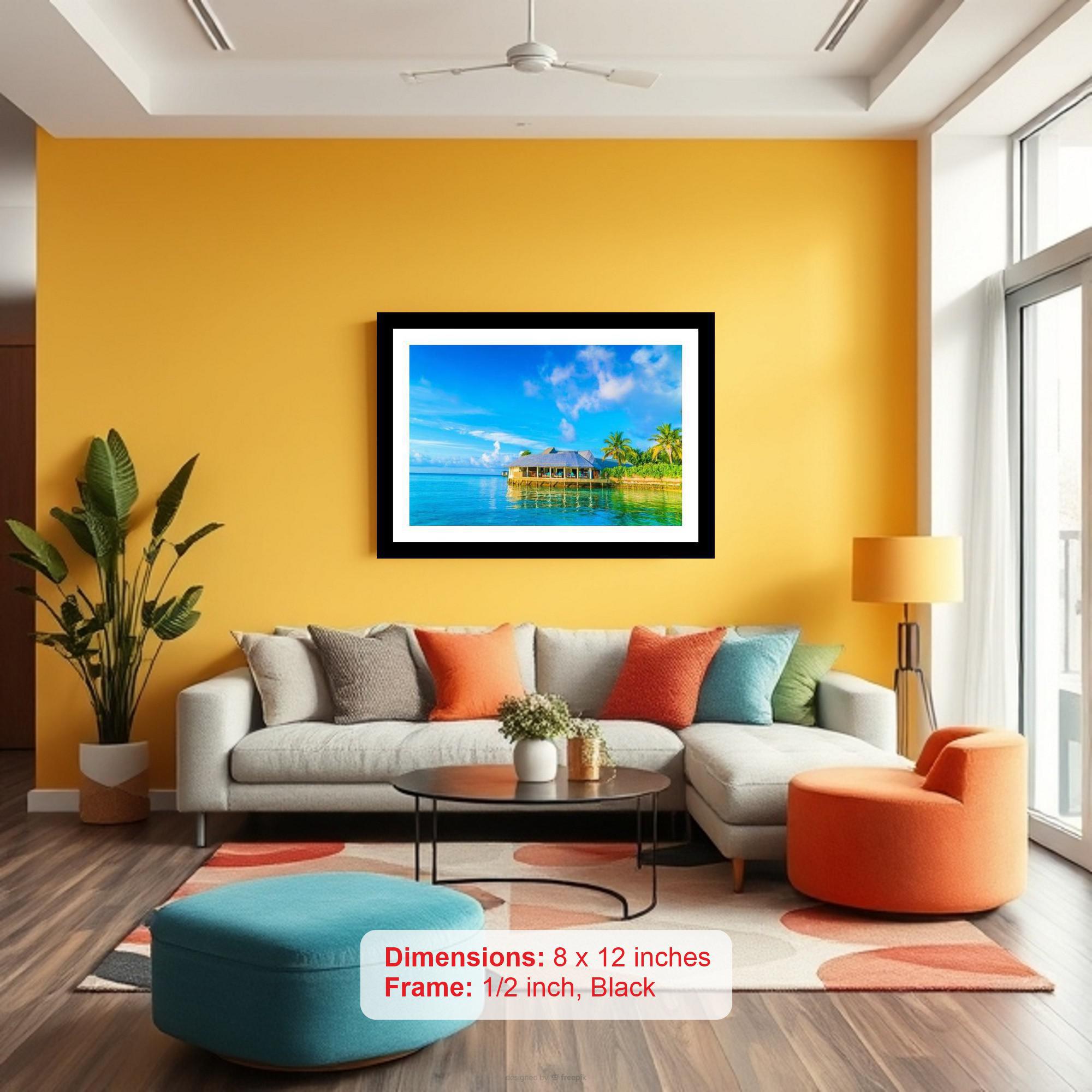 Picture-perfect paradise! Turquoise water, swaying palms, and a luxurious bungalow under a bright blue sky. The reprint explodes with vibrant color and stunning detail, a true testament to the original photo's beauty! The reprint boasts a striking composition, beautifully rendering the original photograph's artistry with digital precision. Versatile Decor: Ideal for enhancing the aesthetic appeal of living rooms and bedrooms Enhanced Durability: Weather-shield laminated digital print for lasting vibrancy and protection Premium Framing: Constructed with a high-quality, durable fiber frame for long-term stability Precise Dimensions: 30 cm x 20 cm x 1 cm