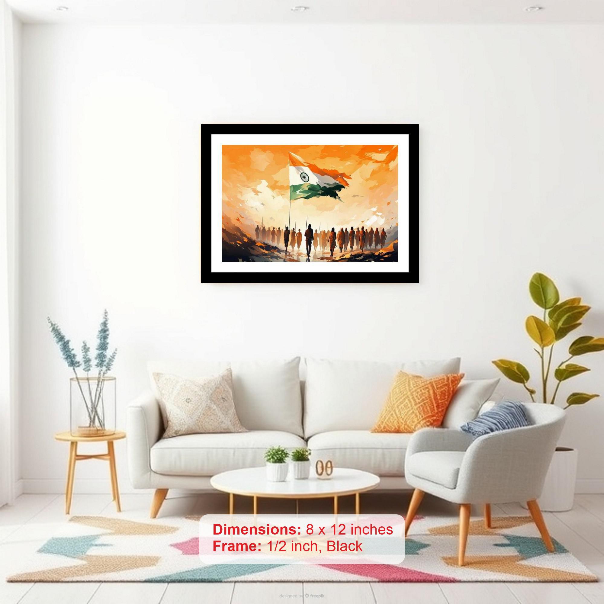A powerful depiction of unwavering Indian patriotism as a resolute army marches towards a glorious sunrise. The reprint's colors sing and the print is sharp; it truly brings this beautiful portrait to life again! The digital reprint boasts a striking composition, breathing new life into the portrait's captivating beauty. Versatile Decor: Ideal for enhancing the aesthetic appeal of living rooms and bedrooms Enhanced Durability: Weather-shield laminated digital print for lasting vibrancy and protection Premium Framing: Constructed with a high-quality, durable fiber frame for long-term stability Precise Dimensions: 30 cm x 20 cm x 1 cm
