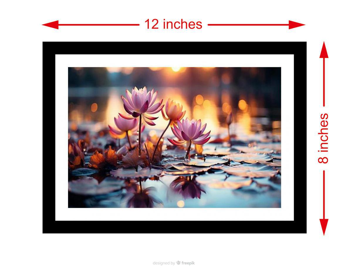 A stunning sunset photo captures the serene beauty of pink water lilies, their reflections creating a magical dance on the water. The colors are vibrant and the print is so crisp, it's like looking through a window. The reprint's striking composition elevates the original photograph, breathing new life into a timeless image. Versatile Decor: Ideal for enhancing the aesthetic appeal of living rooms and bedrooms Enhanced Durability: Weather-shield laminated digital print for lasting vibrancy and protection Premium Framing: Constructed with a high-quality, durable fiber frame for long-term stability Precise Dimensions: 30 cm x 20 cm x 1 cm