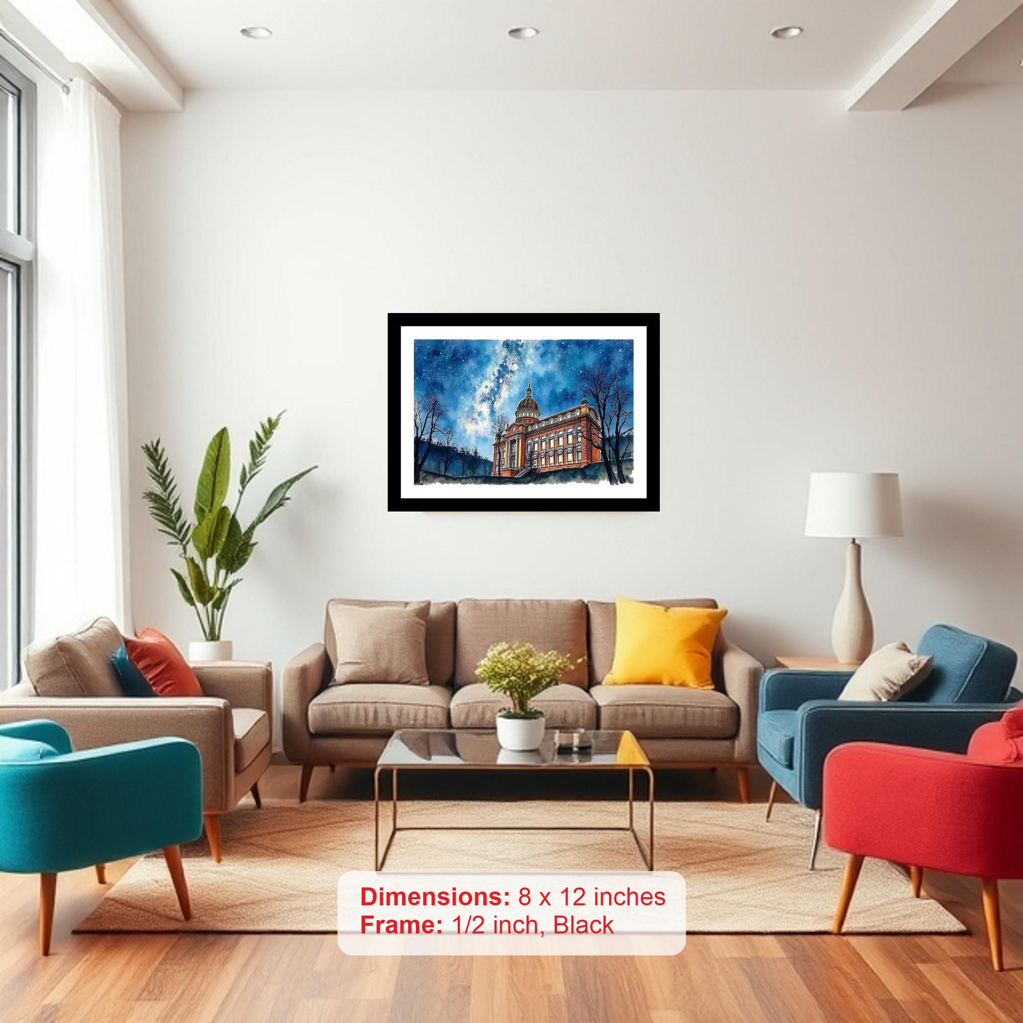 Immerse yourself in the grandeur of a bygone era with our elegantly framed digital reprint of a captivating Victorian palace portrait set against a vibrant night sky. This exquisite piece of art evokes a sense of timeless beauty and romanticism, perfectly capturing the architectural splendor of the Victorian age. The classic black frame adds a touch of sophistication and complements the artwork seamlessly, making it an ideal addition to any home or office decor. The vibrant night sky, a swirling canvas of deep blues, purples, and shimmering stars, provides a breathtaking backdrop to the majestic palace, creating a mesmerizing visual contrast that draws the eye and sparks the imagination. This high-quality digital reprint faithfully reproduces the intricate details and rich colors of the original painting, ensuring a stunning visual experience that will be cherished for years to come. Whether you are an avid art collector, a history enthusiast, or simply looking to add a touch of elegance to your living space, this framed Victorian palace portrait is sure to be a conversation starter and a cherished heirloom. Its classic aesthetic blends seamlessly with a variety of interior styles, from traditional to contemporary, adding a touch of sophistication and intrigue to any room. Bring the allure of Victorian architecture and the magic of a starlit night into your home with this stunning piece of art.